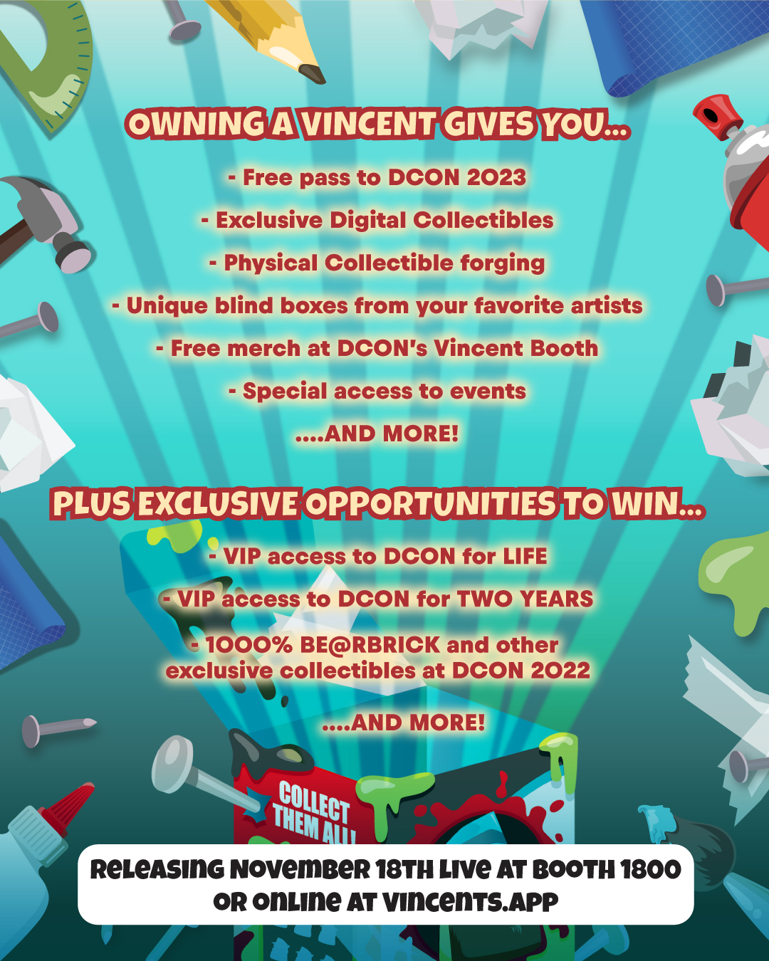 Vincents is a new DesignerCon exclusive membership collectible powered by innovative blockchain technology that will allow us to curate online and IRL experiences for our community like never before. Just like a collectible, Vincents will be extremely limited in supply. And in addition to owning the very first DesignerCon exclusive Vincent digital collectible, holders will be given exclusive perks and rewards for simply being a part of our ecosystem. The chance to forge physical collectibles, access to exclusive events, early-access to all things DesignerCon, and more — the possibilities are endless.